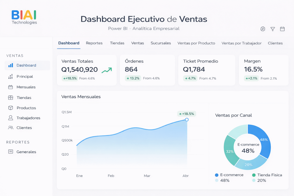 Diseñamos dashboards ejecutivos en Power BI que consolidan ventas, tiendas, sucursales y desempeño por colaborador en una sola vista estratégica.